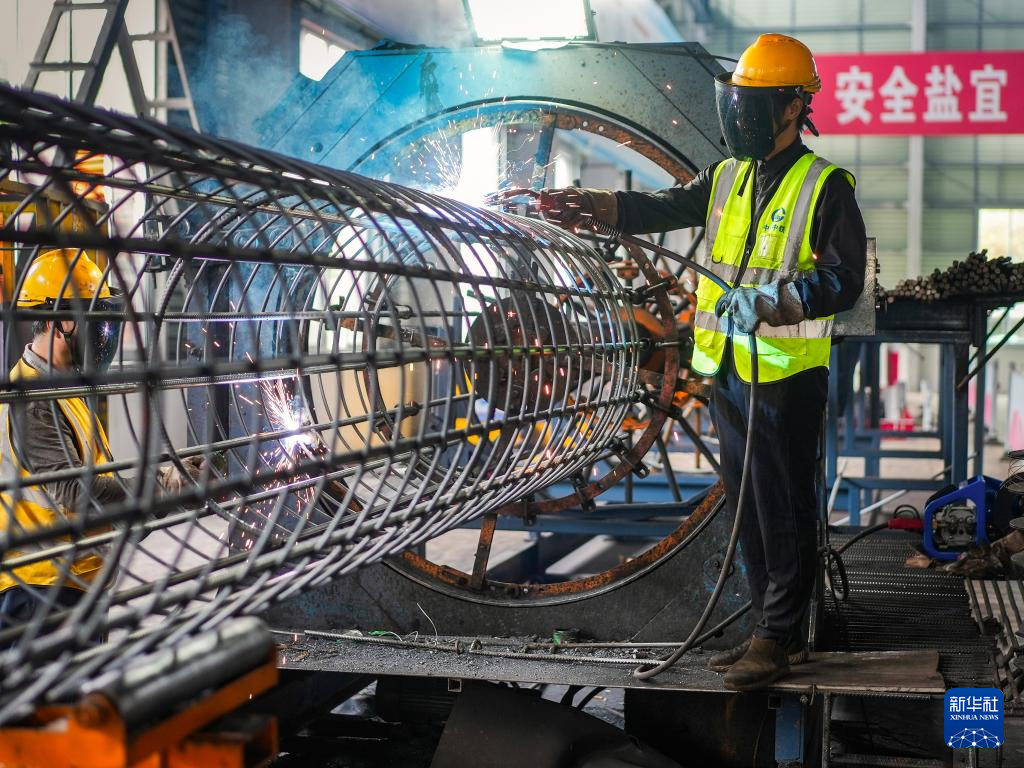 10月1日,工人在位于江苏省兴化市陈堡镇的中铁上海工程局盐宜铁路项目部钢筋加工场进行焊接作业。