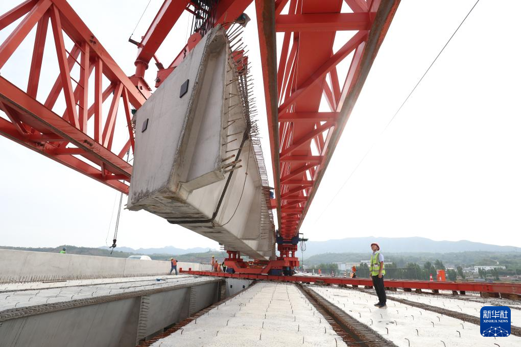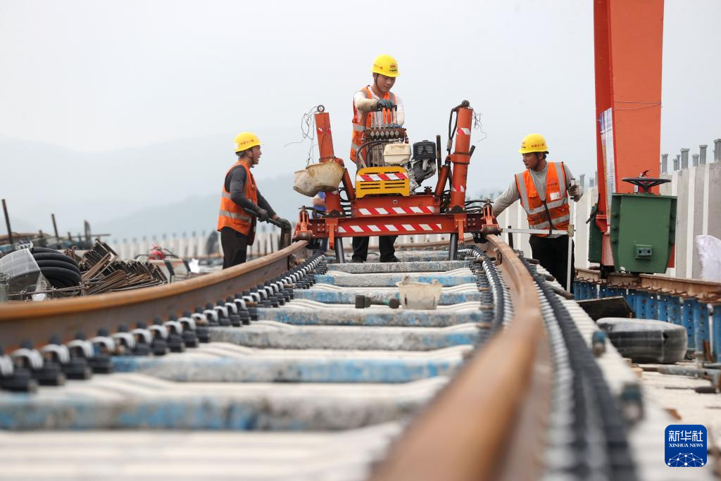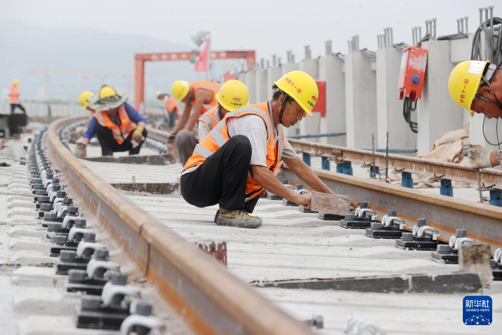 10月1日,中铁十一局建设者在浙江省湖州市德清县杭德市域铁路高架线铺轨现场施工作业。