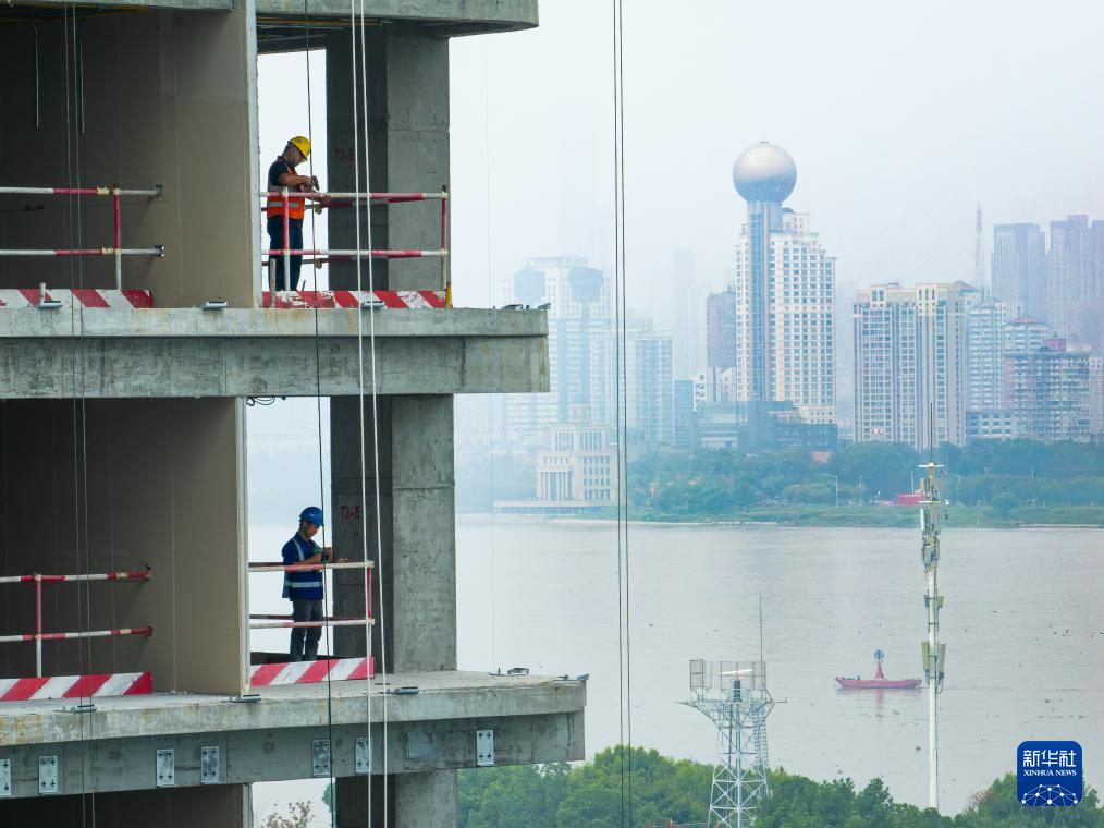 10月1日,中建三局三公司工人在位于湖北省武汉市武昌区一处项目工地进行施工作业(无人机照片)。
