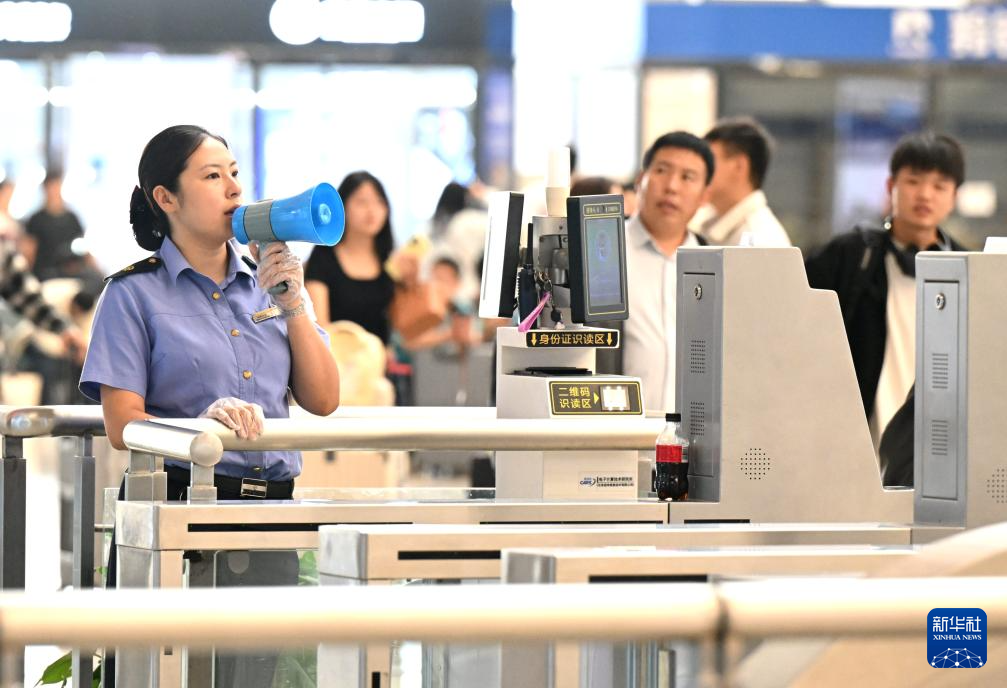 10月1日,铁路工作人员在河北石家庄火车站候车大厅忙碌。