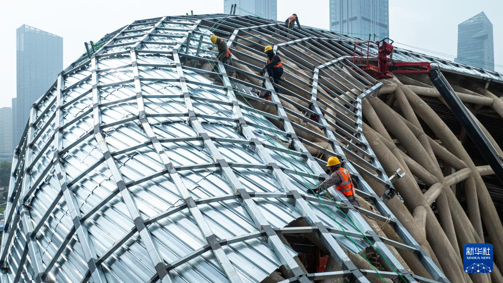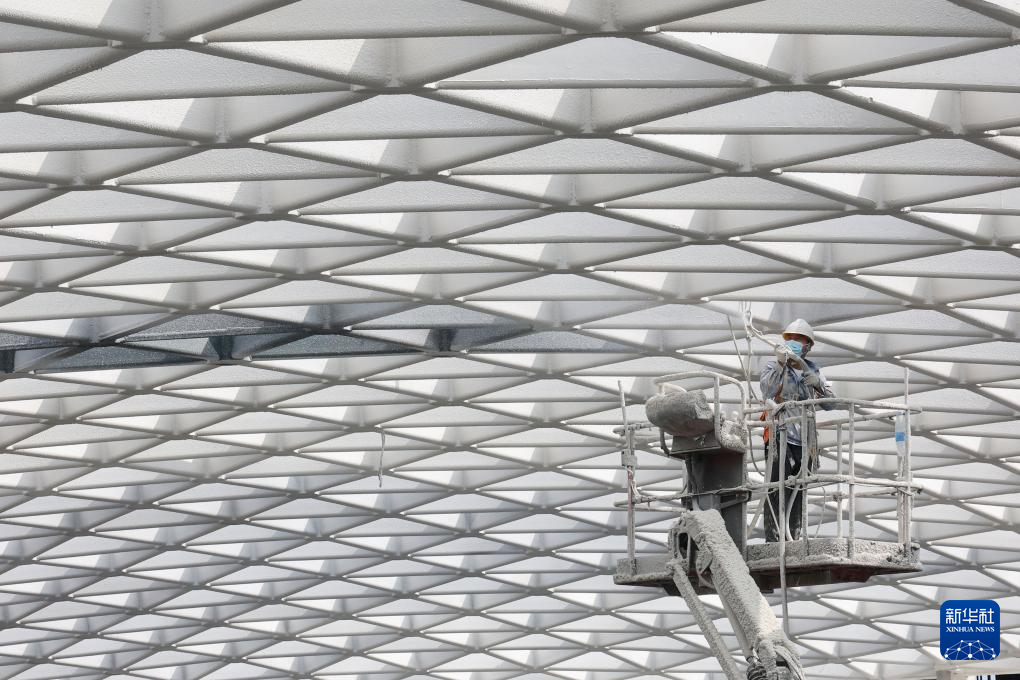 10月1日,在江苏省无锡市奥体中心三期项目现场,中建二局工人对钢结构进行防火涂料喷涂作业。