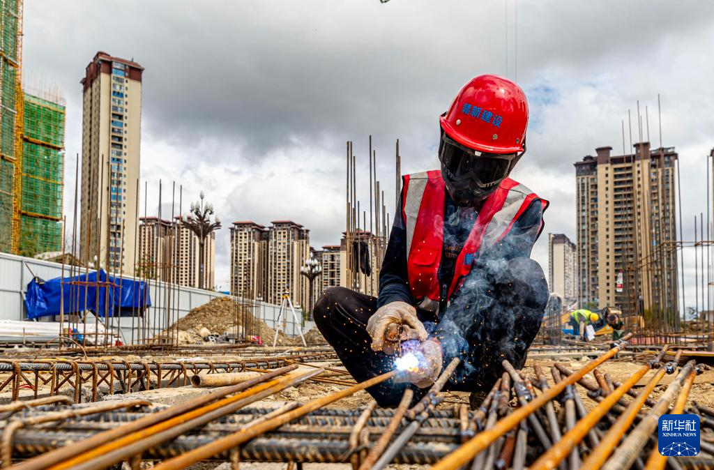 10月1日,工人在贵州省黔西市一建筑工地进行钢筋焊接作业。