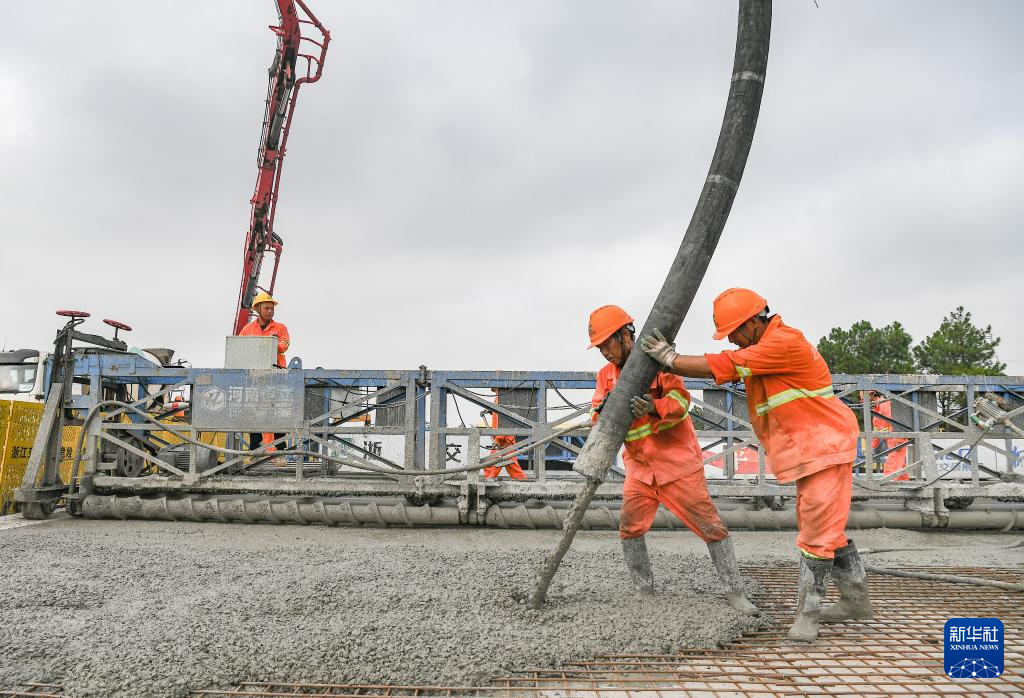 10月1日,在浙江省金华市甬金衢上高速公路金华城区段工地,施工人员在浇筑混凝土。