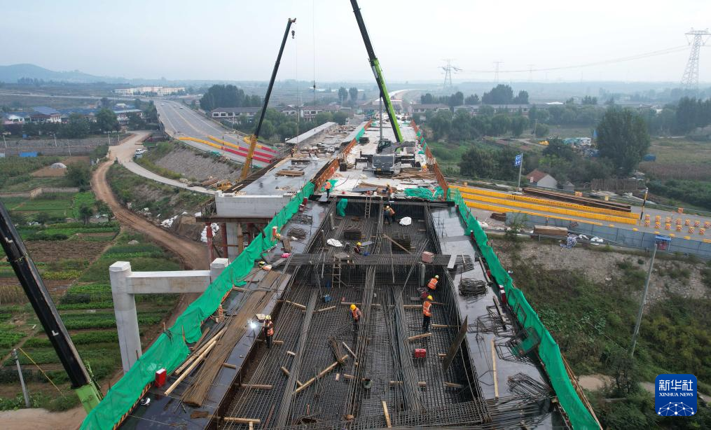 10月1日,工人在董梁高速公路沈新段山东省沂南县铜井镇鲁家庄互通建设工地施工作业(无人机照片)。