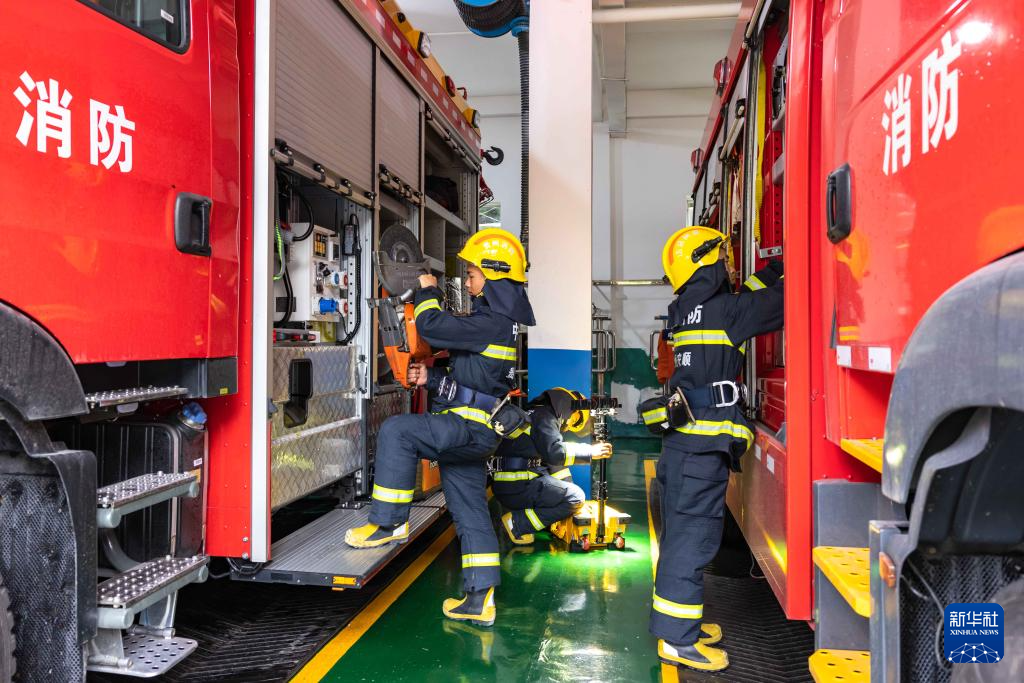 10月1日,贵州省安顺经济技术开发区消防救援大队消防救援人员在检查装备。