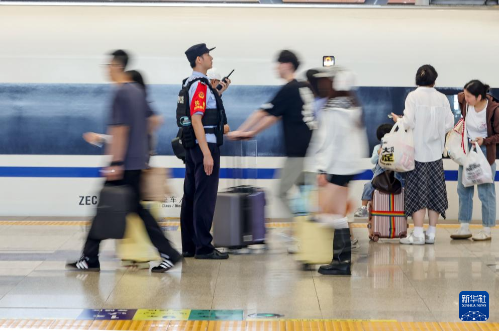 10月1日,武汉铁路公安处武汉站派出所民警在武汉站巡查。