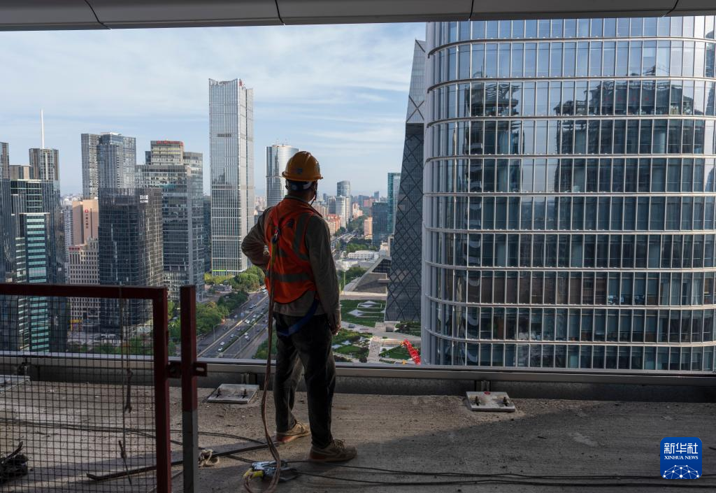 10月1日,在北京CBD核心区Z3项目上,玻璃幕墙安装工人在施工间歇观赏城市景色。