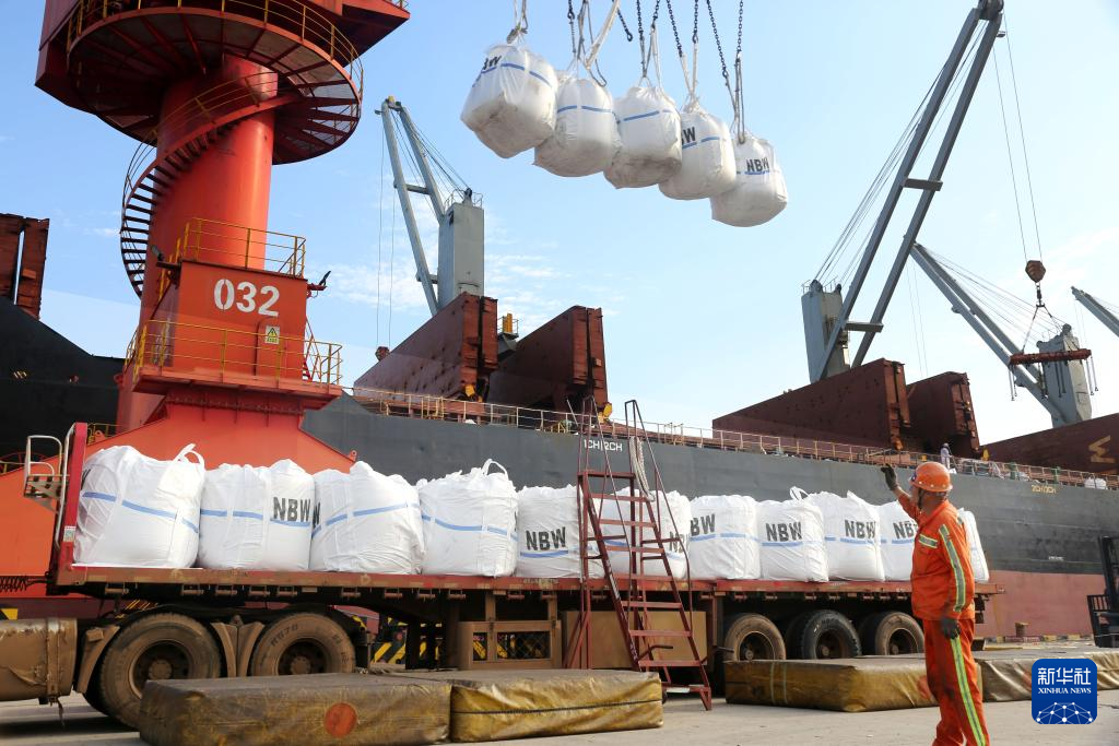 10月1日,码头工人在江苏省连云港港东方港务分公司码头上忙碌。