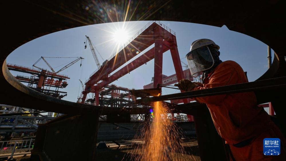 10月1日,在天津市滨海新区,渤海油田工人进行打磨作业。