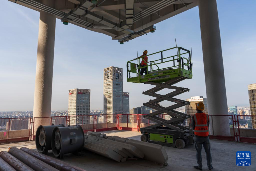 10月1日,在北京CBD核心区Z3项目上,中建二局安装工程有限公司机电安装工人在施工。