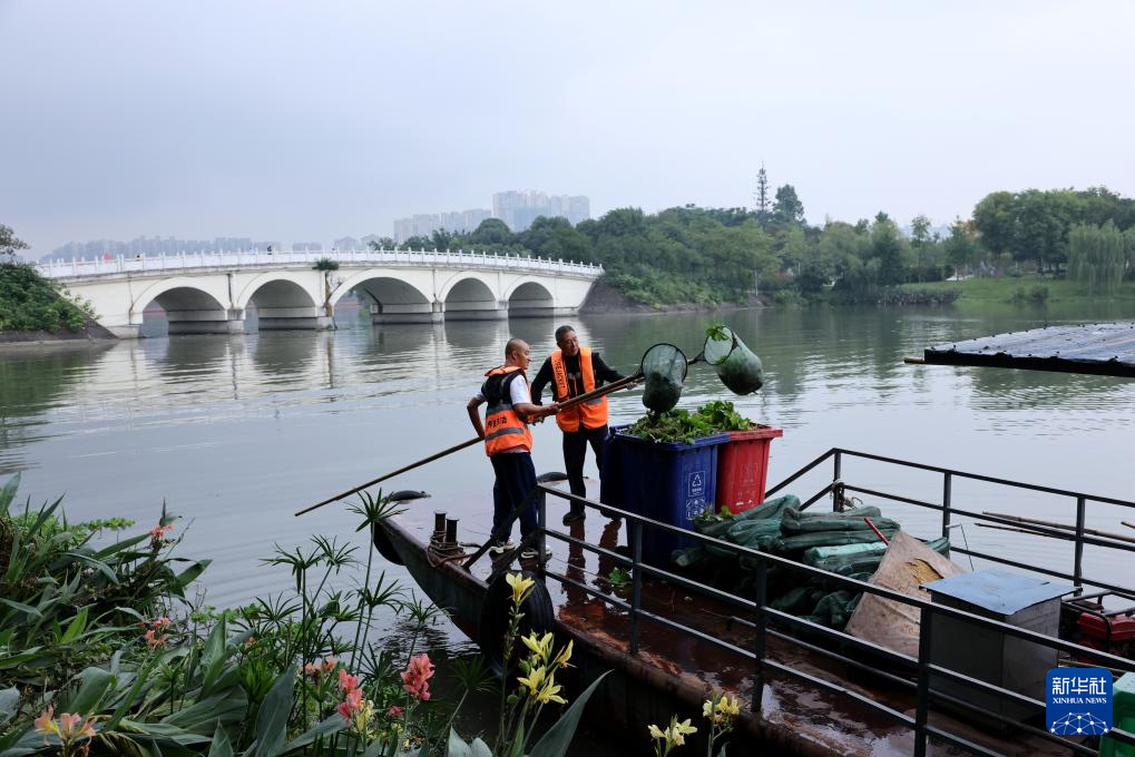 10月1日,四川省眉山市东坡区环卫工人在东坡湖上打捞水草。