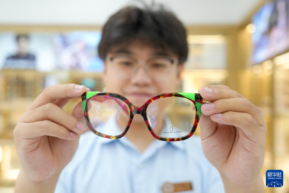 在中国丹阳国际眼镜城内,工作人员展示眼镜镜架(9月25日摄)。
