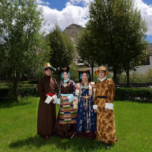 班珠丹塔(右一)和模特合影留念,模特们穿着由他设计的藏装(9月9日摄)。