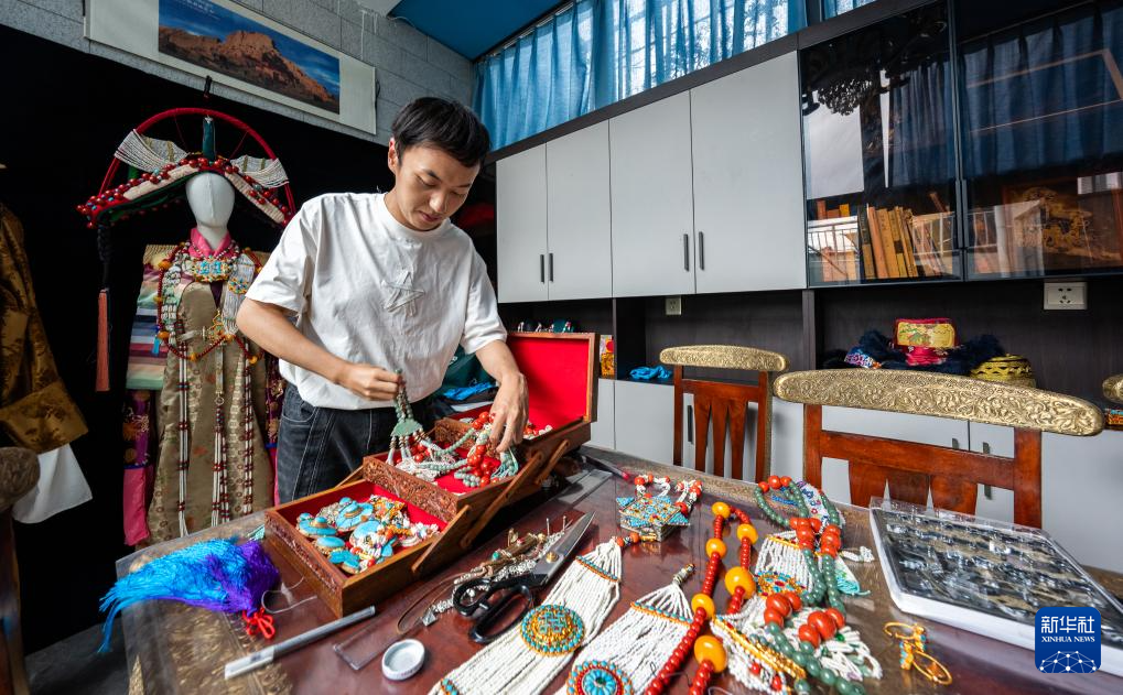 班珠丹塔在家中工作室内整理自己做的藏式配件(9月11日摄)。