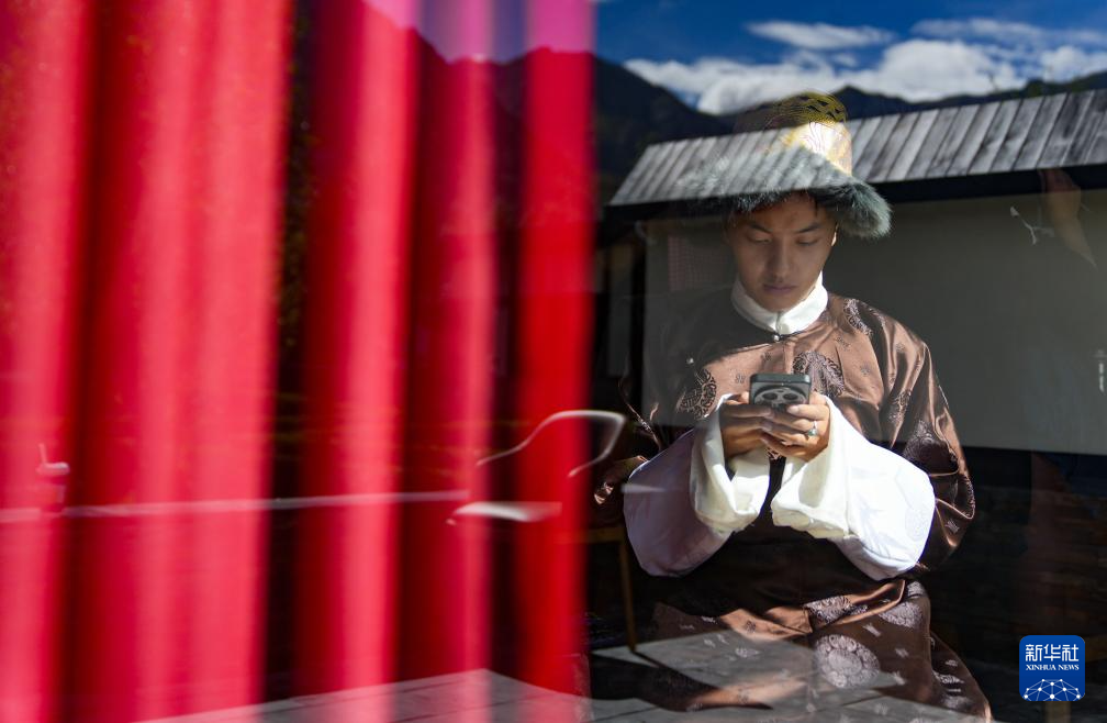 班珠丹塔在棚拍间隙处理工作事宜(9月9日摄)。