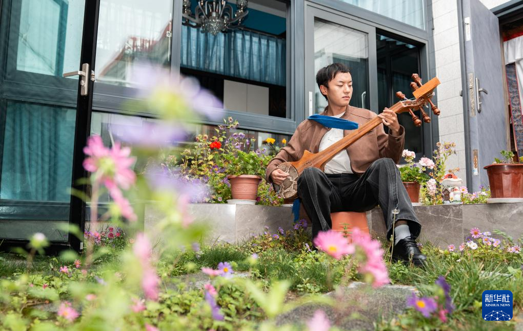 班珠丹塔在家中设计藏装间隙弹奏扎念琴(9月11日摄)。