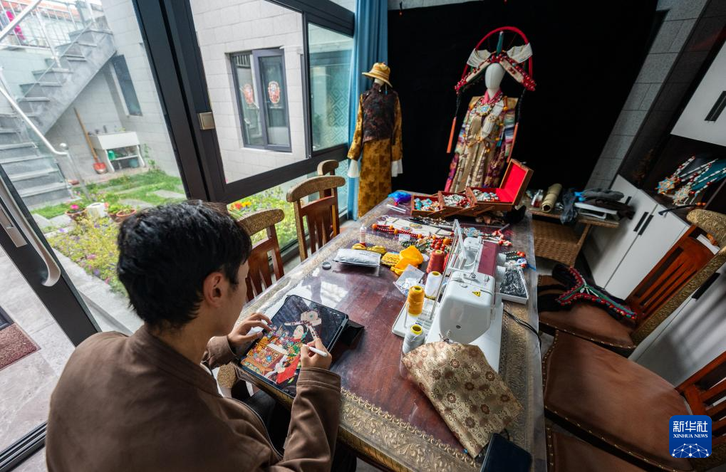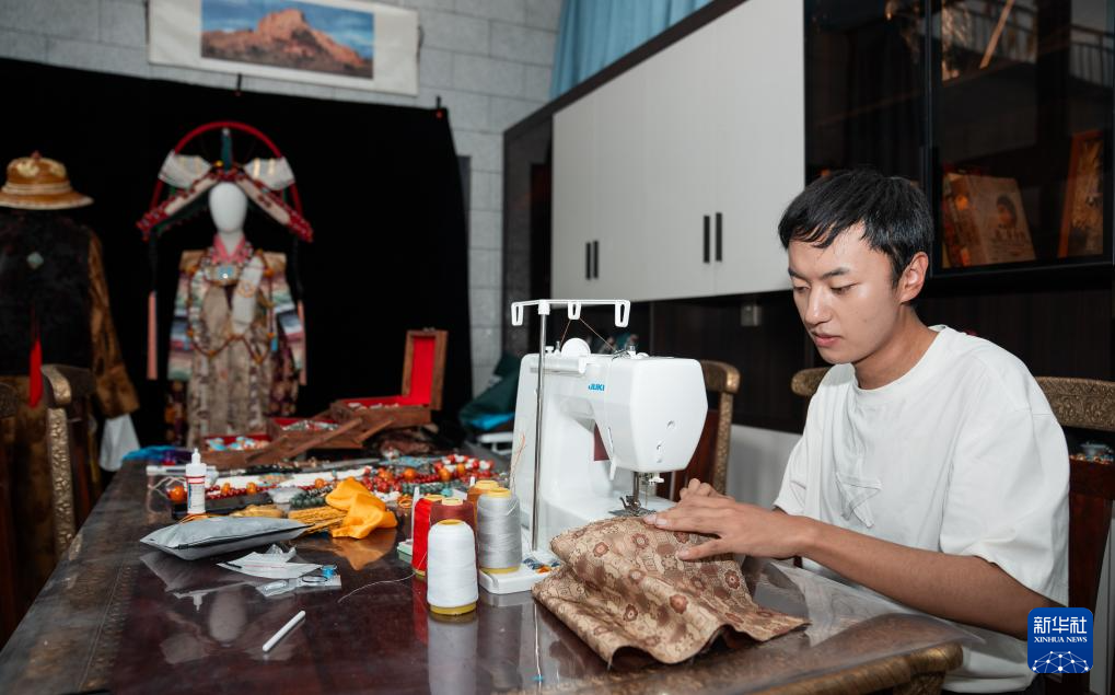 班珠丹塔在家中工作室设计藏装(9月11日摄)。