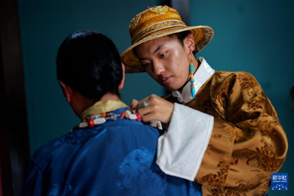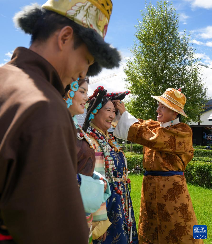 班珠丹塔为模特调整藏装配饰(9月9日摄)。