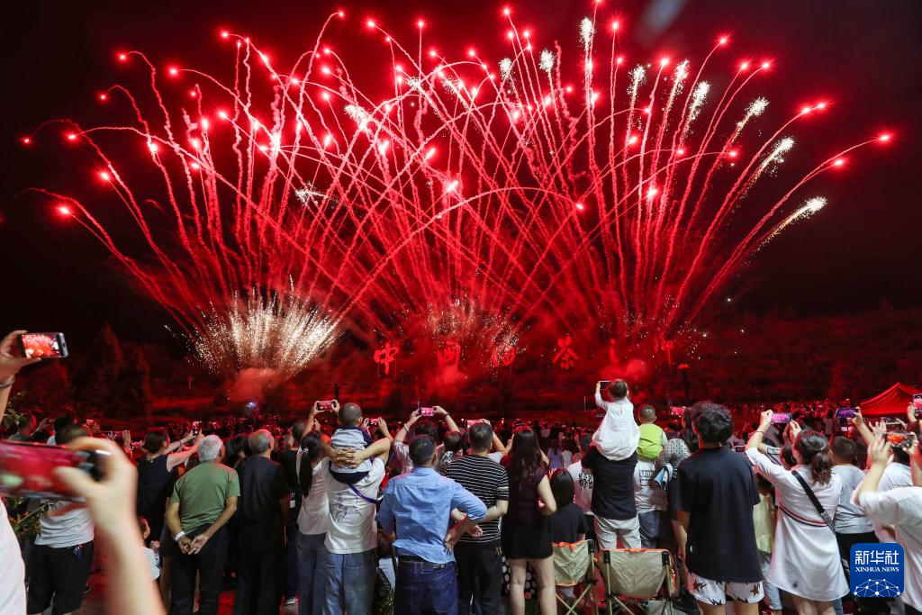 10月3日晚,游客在贵州省铜仁市玉屏侗族自治县茶花泉景区观看烟花。