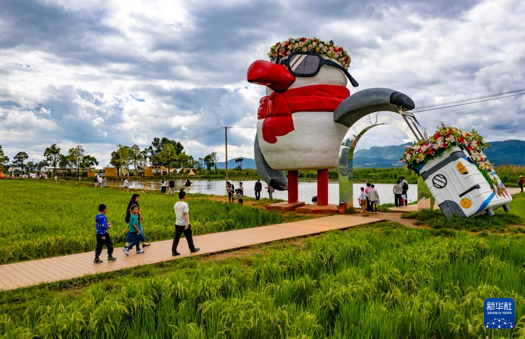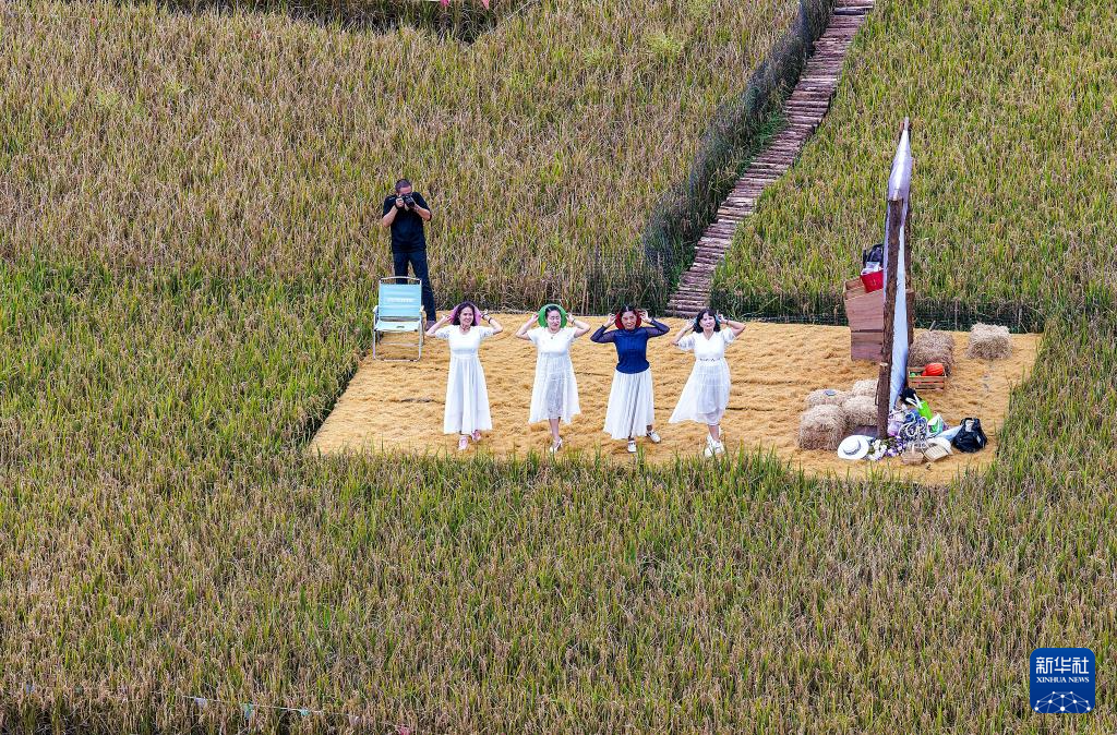 10月4日,游客在云南省曲靖市沾益区大坡乡威格村稻田游玩(无人机照片)。