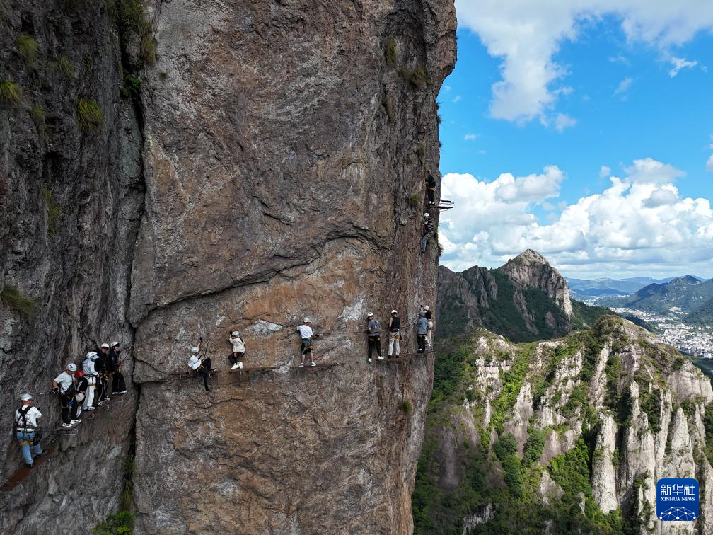 10月4日,游客在浙江省乐清市龙西乡沓屏峰体验“飞拉达”运动(无人机照片)。
