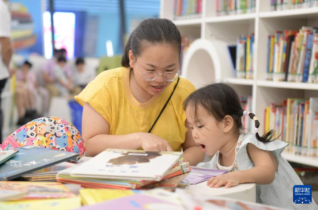 10月4日,一位妈妈带着孩子在广州图书馆里阅读。