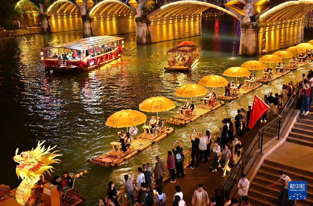 10月3日晚,游客在湖北省宣恩县城贡水河中体验“龙游贡水”竹筏。