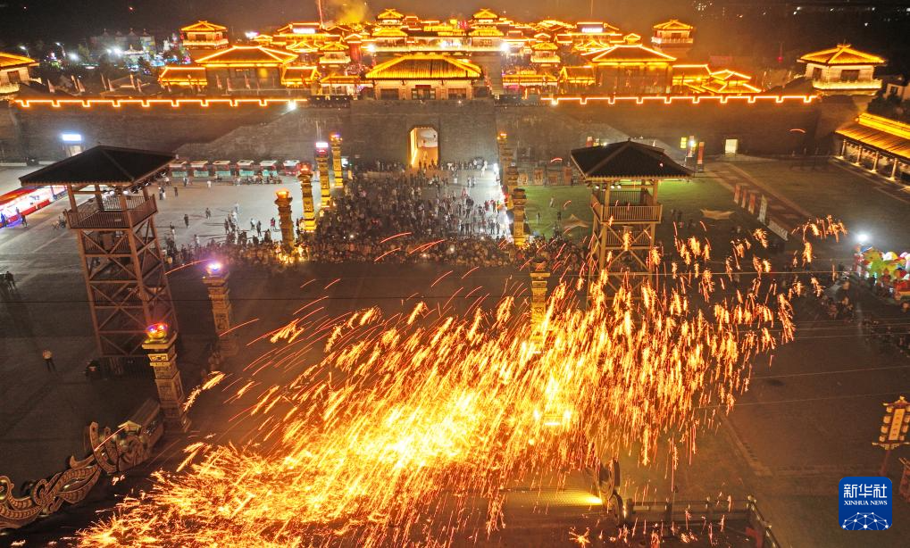 10月3日晚,游客在山东省临沂市郯城县郯国古城景区观看打铁花(无人机照片)。