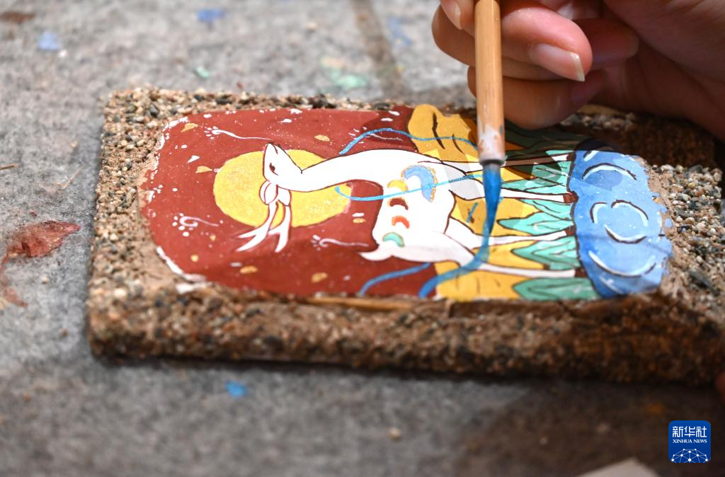 10月4日,在甘肃省敦煌印局研学课堂,游客学习临摹敦煌壁画。