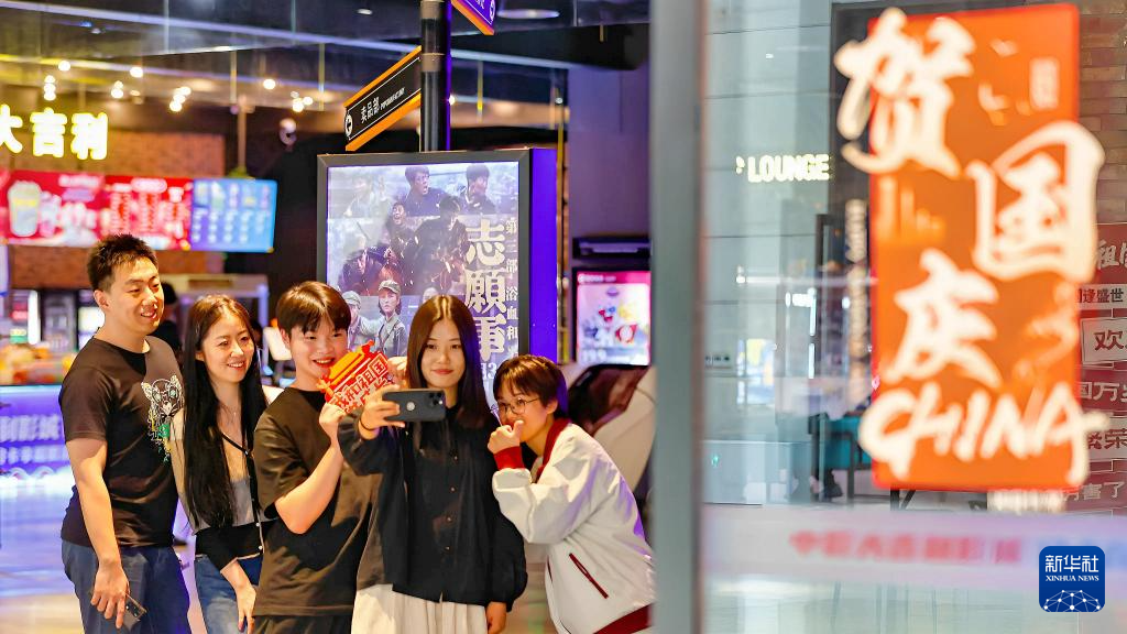 10月4日,在天津市滨海新区一影城,观众与电影海报合影。