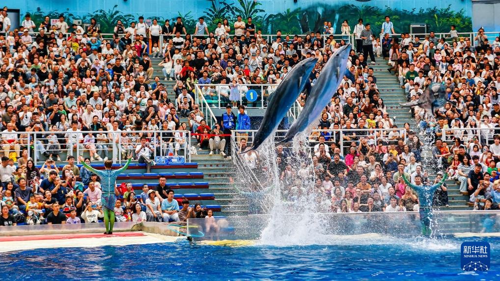 10月4日,在天津市滨海新区极地海洋度假区,游客观看表演。