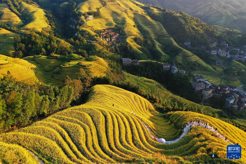10月4日,在广西壮族自治区桂林市龙胜各族自治县龙脊梯田,游客在观光游览(无人机照片)。