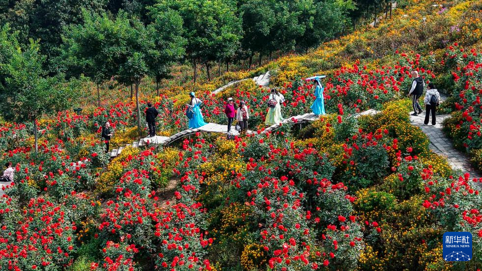10月4日,游客在河北省承德市兴隆县一处花海游玩(无人机照片)。