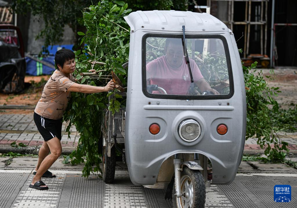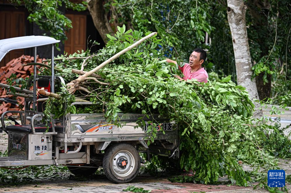 10月6日,在海南文昌,居民将自家门前被台风吹断的树枝装车、转运。
