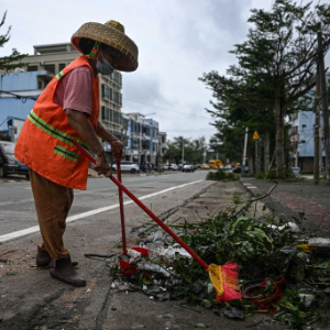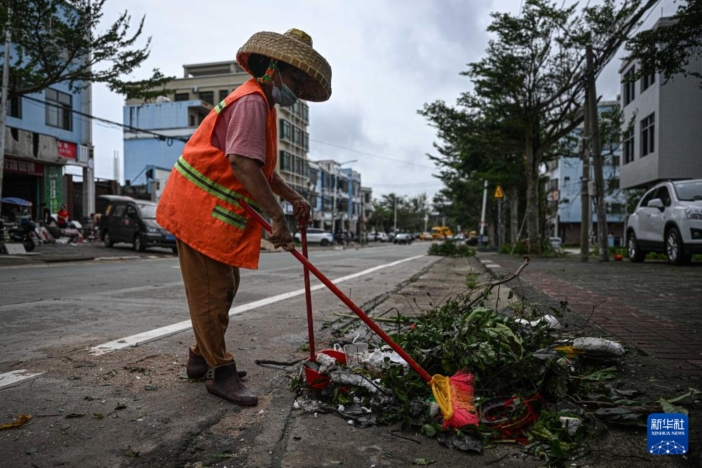 10月6日,环卫工人在海南文昌街头清理被台风吹断的树枝等杂物。
