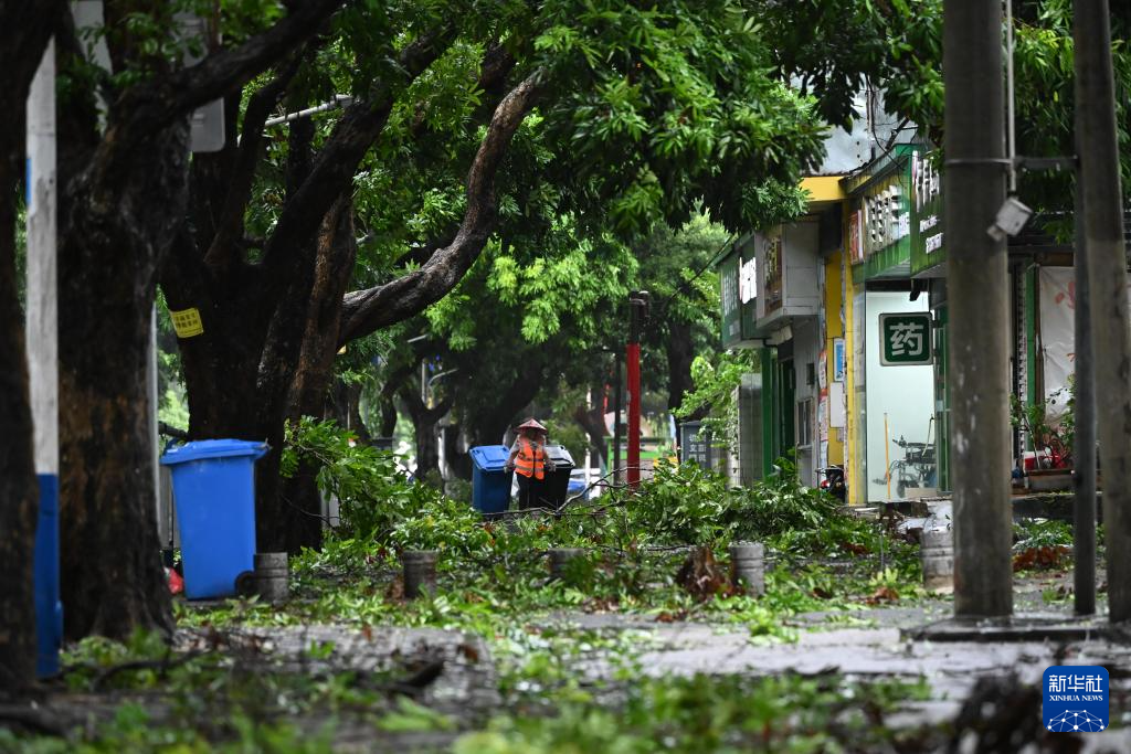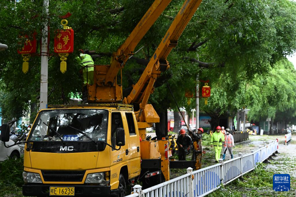 10月6日,园林工作人员在北海市海城区清理路边倒伏树木。