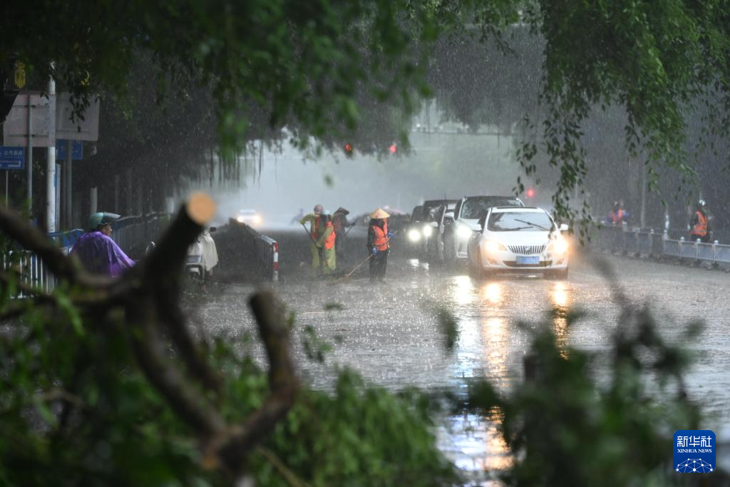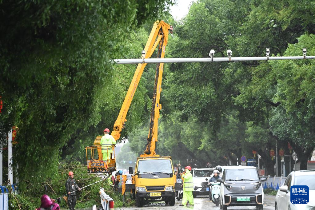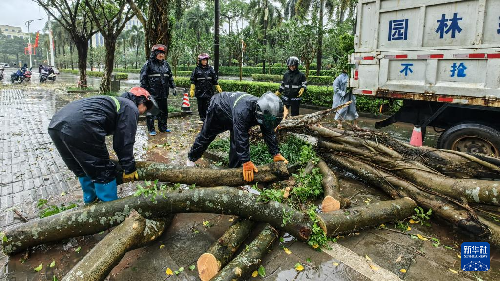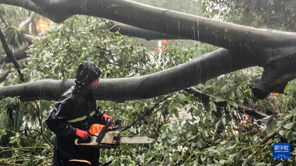 10月6日,钦州市环卫工人冒雨清理被台风吹倒的大树。