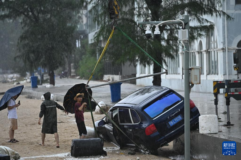 10月6日,在北海市海城区北岸海堤,人们对一辆被台风刮翻的小汽车施救。
