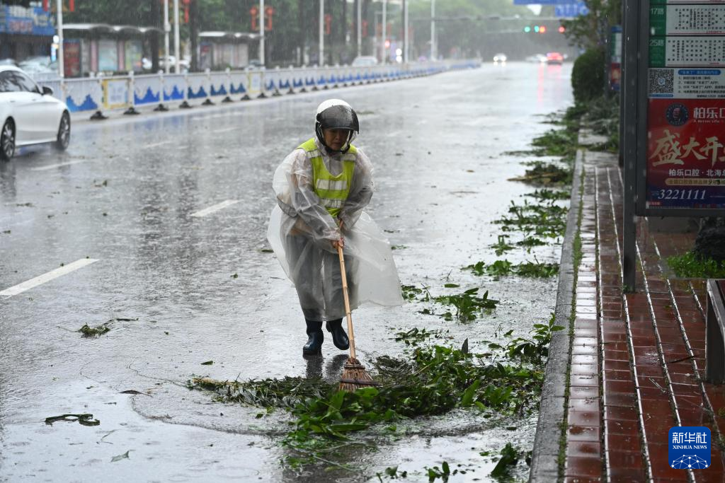 10月6日,环卫工人在北海市海城区清理路面。