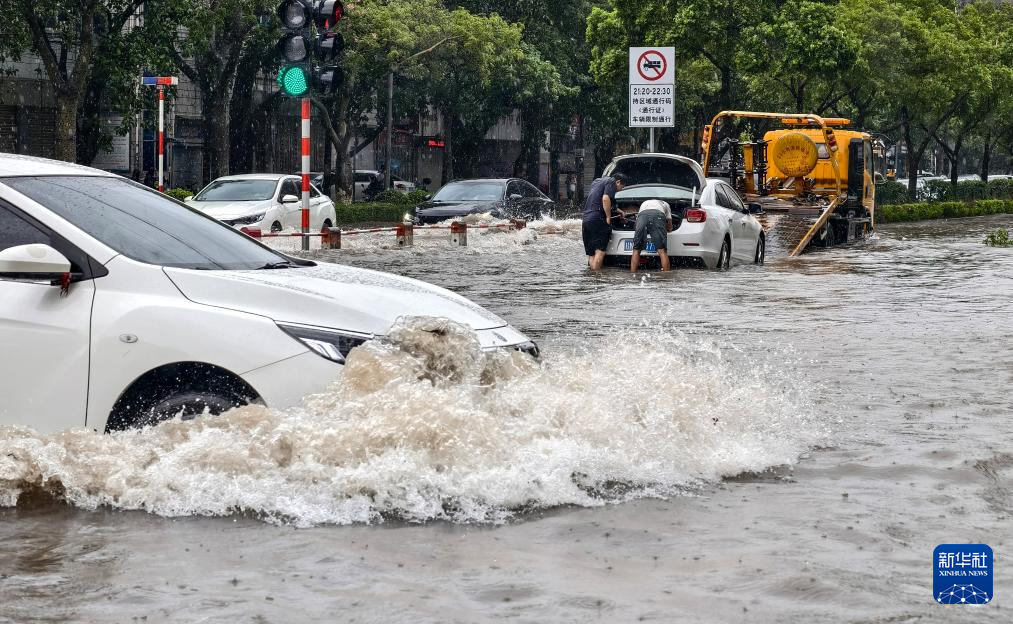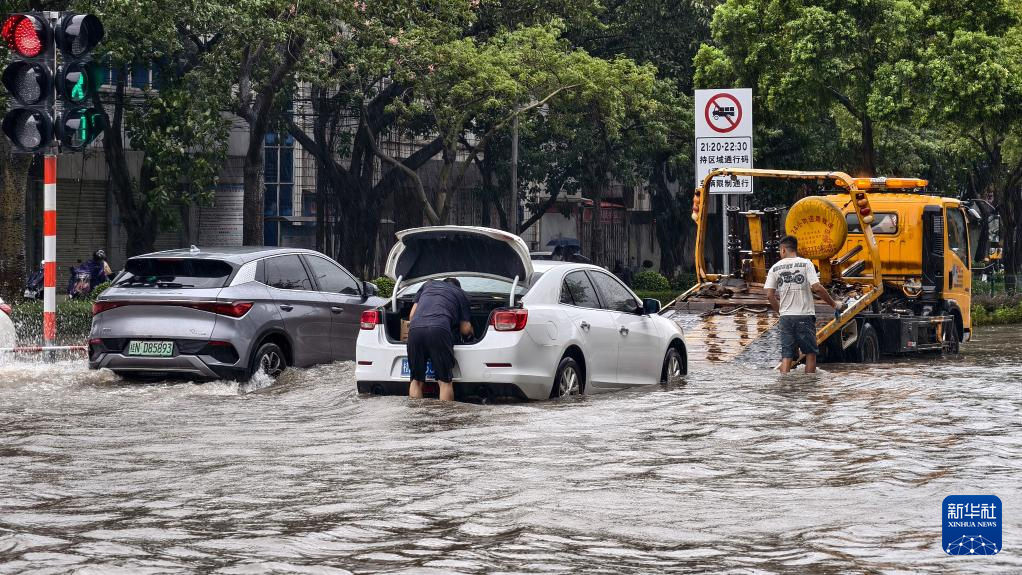 10月6日,在钦州市区,救援车辆对涉水车辆进行拖救。