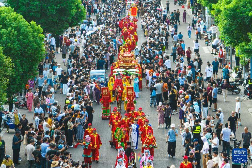 10月6日,在浙江省宁波市鄞州区咸祥镇,民俗队伍巡游街巷热闹非凡(无人机照片)。