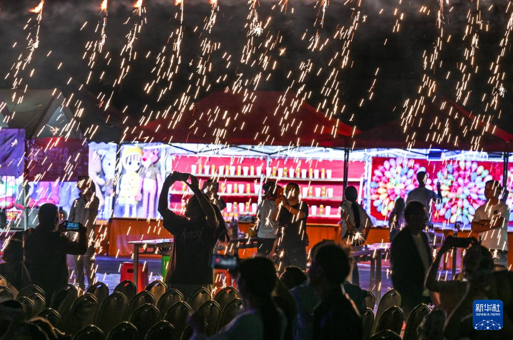 10月5日晚,游客在贵州省晴隆县阿妹戚托小镇观看焰火表演。