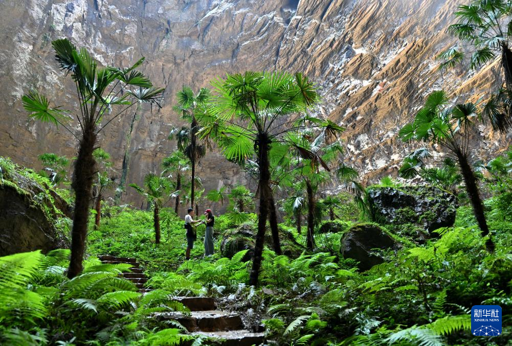10月6日,游客在湖北省宣恩县矅天眼景区深达290余米的锣圈岩天坑底部观光游玩。