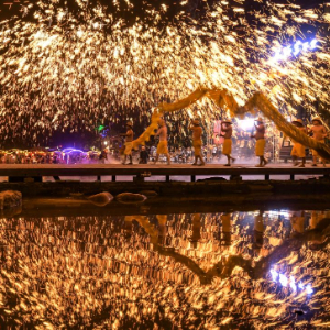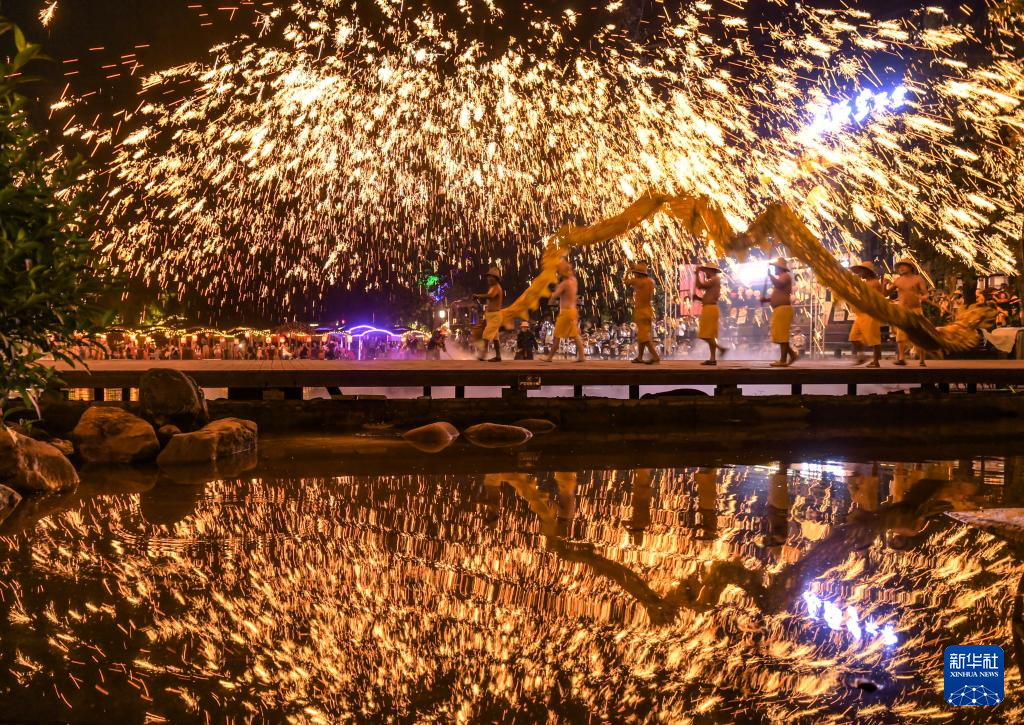 10月5日晚,在四川省成都市双流区黄龙溪古镇,民间艺人为游客表演非遗“火龙灯舞”。