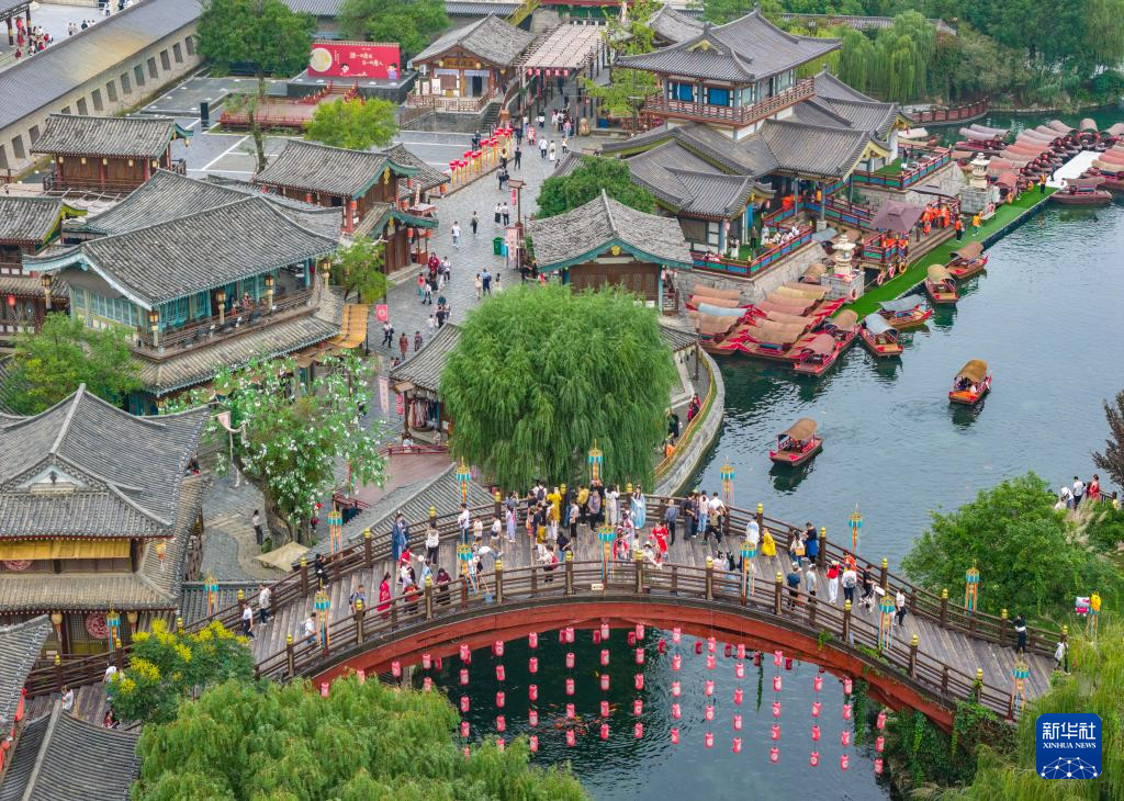10月5日,游客在湖北省襄阳市唐城景区游玩(无人机照片)。