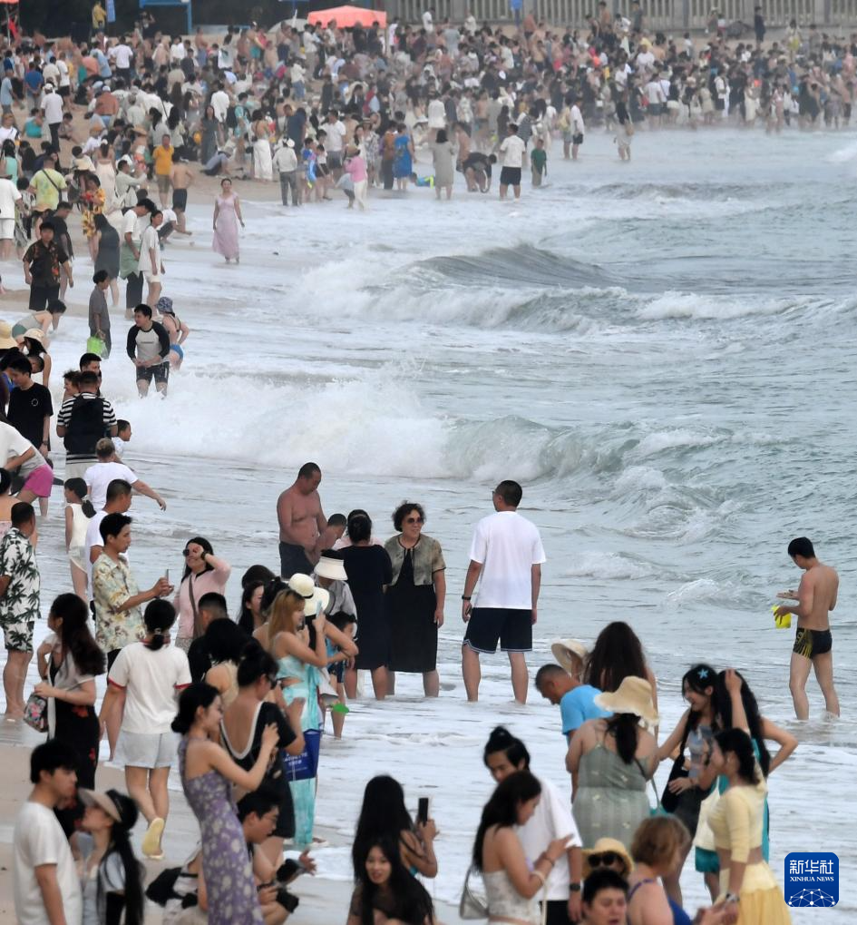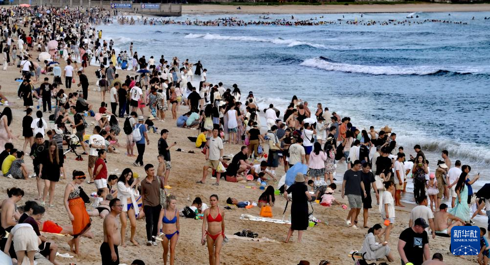 10月6日,在海南省三亚市大东海景区,市民和游客在海滩戏水。