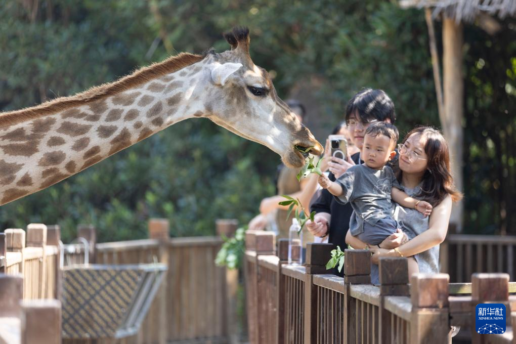 10月6日,小朋友在上海野生动物园与长颈鹿互动。