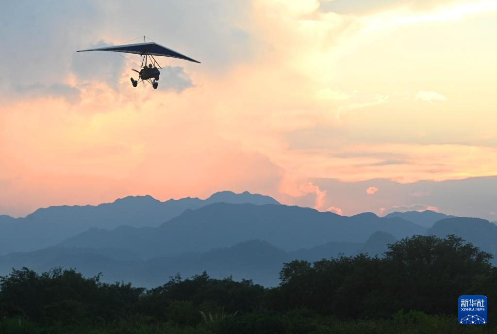 10月6日,游客在浙江省金华市武义县大斗山飞行营地乘坐动力三角翼。