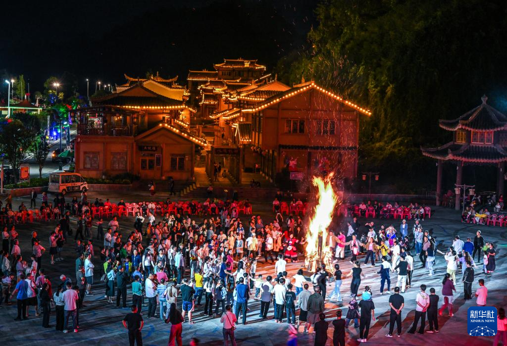 10月5日晚,在贵州省晴隆县阿妹戚托小镇,游客与当地群众围着篝火共舞。
