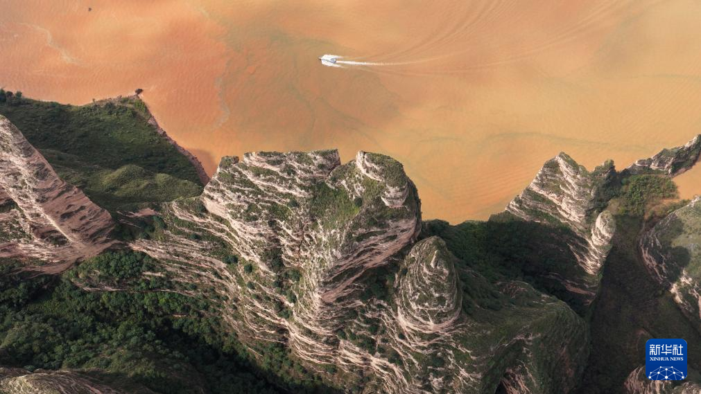 10月6日,游客乘船在甘肃炳灵丹霞国家地质公园游览(无人机照片)。